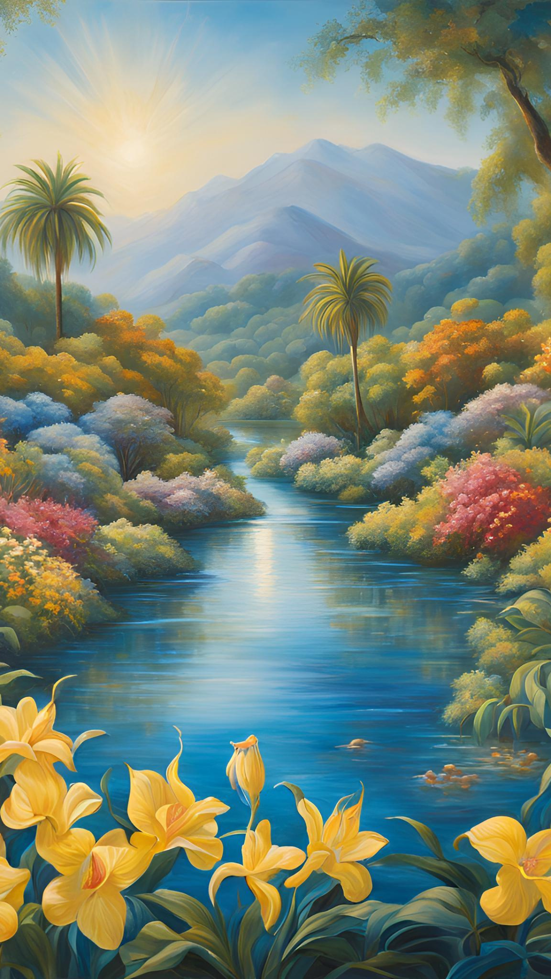 ✨ Tags: flower paradise wallpaper, lagoon lake design, nature-inspired phone background, serene floral wallpaper, tranquil water scene, peaceful landscape wallpaper, vibrant flower digital art, tropical lagoon phone wallpaper, calming wallpaper design, enchanting nature phone background.
