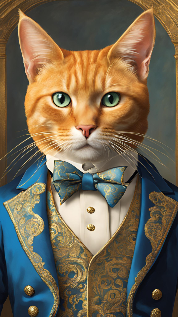 - Adorable orange cat depicted in 18th-century noble attire with fine detailing.
